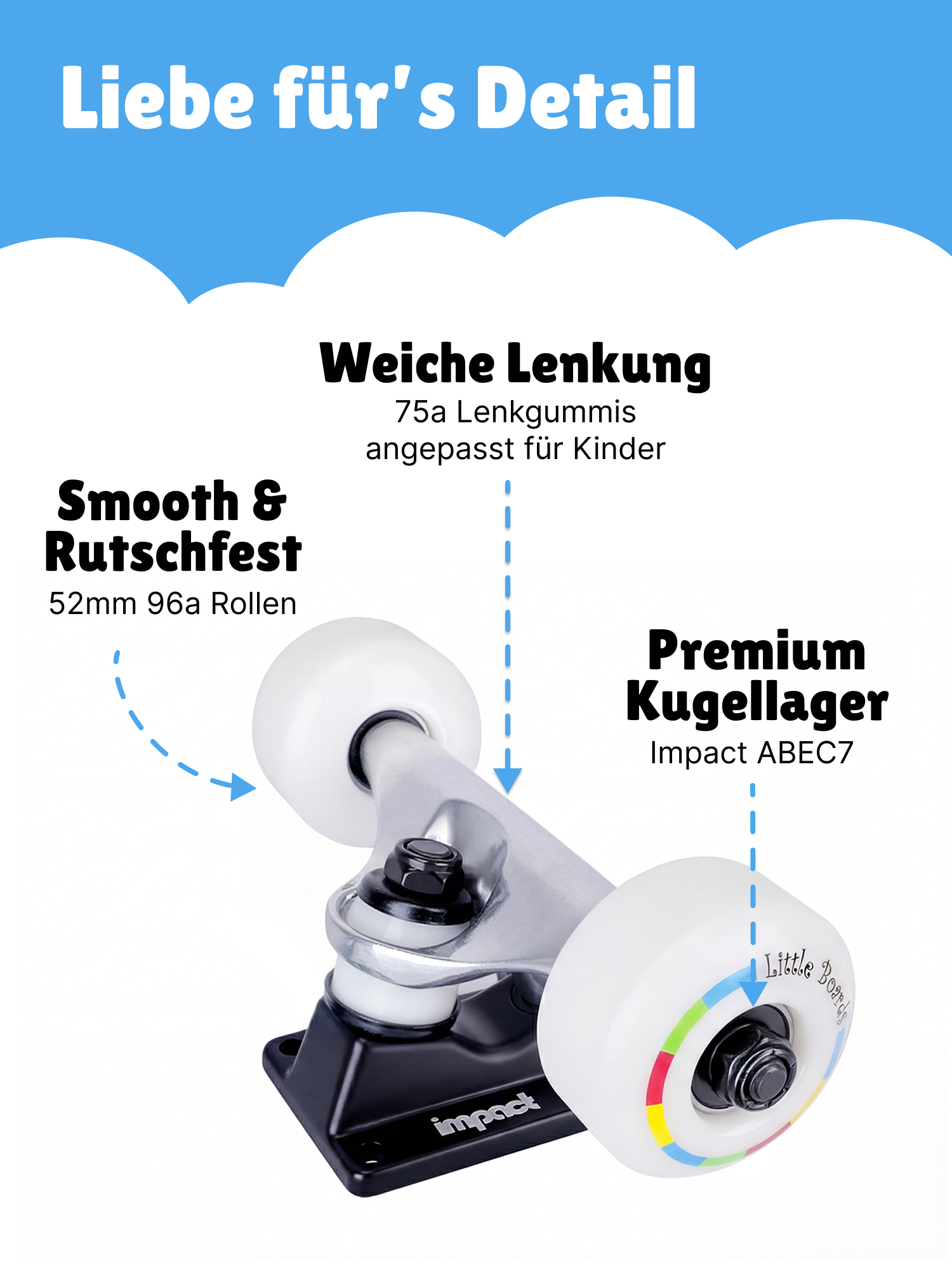 Das LittleBoards "Cartoon" ist mit seiner kompakten Größe von 7.3 Inch ein ideales Komplett-Skateboard für Kinder zwischen 8 und 11 Jahren. Perfekt aufeinander abgestimmt, garantieren Deck, Achsen und Rollen ein optimales Fahrgefühl. Das Komplett-Skateboard ist nicht nur eine kluge Wahl für Skateboard-Anfänger, sondern birgt auch für Fortgeschrittene jede Menge Potential.